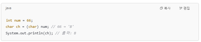 | 실수 → 정수 | (int)실수 | 소수점 날림, 강제 형변환 필요 |