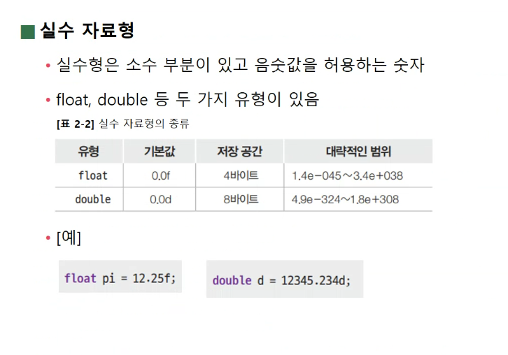 | 예시 | float pi = 12.25f; ← 꼭 f 붙여야 함! |
