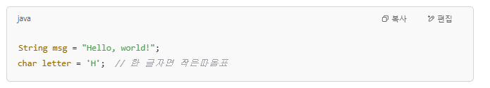 | char | 2바이트 | 문자 1개 저장 | char grade = 'A'; |
