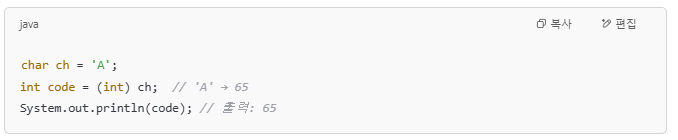 ✅ 2. int → char 변환: 숫자 → 문자