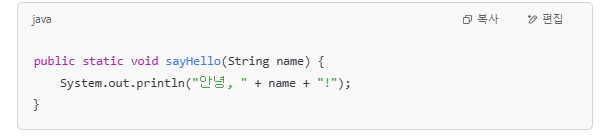 예시 (Java) | ❌ 없음 | public void hello() {} |