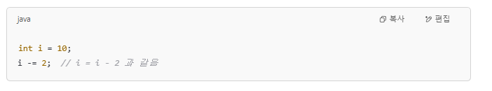 i -= 1 | 1 감소 | i = 5; i -= 1 | i = 4 |