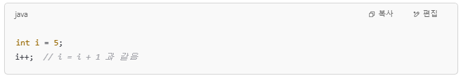 i++ | 1 더하기 | i = 5; i++ | i = 6 |