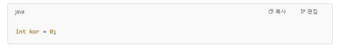 | kor, eng, math, scien, total | 변수명(variable name) | 값을 저장할 이름(즉, 메모리 공간의 이름) |