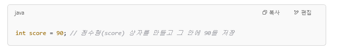 - 여기서 score라는 변수(상자)를 선언하고, 그 안에 90이라는 값을 넣었어요.